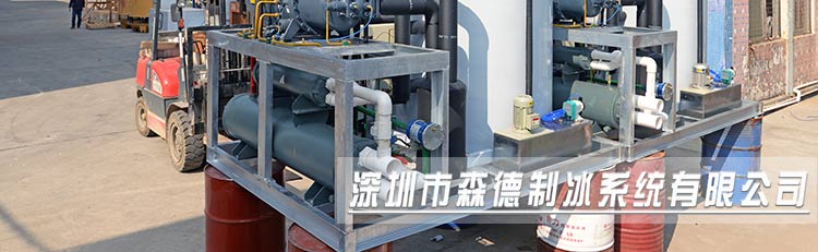 片冰機主要由壓縮機、膨脹閥、冷凝器、蒸發器組成,形成一個循環封閉的制冷系統。片冰機蒸發器為垂直豎立的桶裝結構,主要由冰刀、主軸、灑水盤、接水盤組成。它們在減速機的帶動下,逆時針緩慢旋轉。水從片冰機蒸發器的進水口進入分水盤,通過灑水盤,將水均勻的灑在蒸發器內壁,形成水膜;水膜與蒸發器流道中的制冷劑進行熱交換,溫度迅速降低,在蒸發器內壁上形成一層薄冰,在冰刀的擠壓下,碎裂成片冰,從落冰口掉入儲冰庫。部分未結成冰的水通過接水盤從回水口回流到冷水箱內,通過冷水循環泵進入下一個循環。