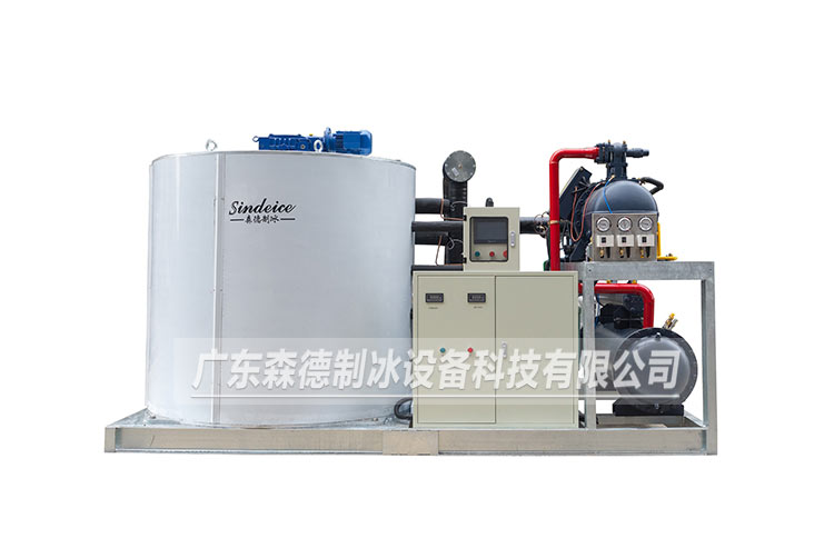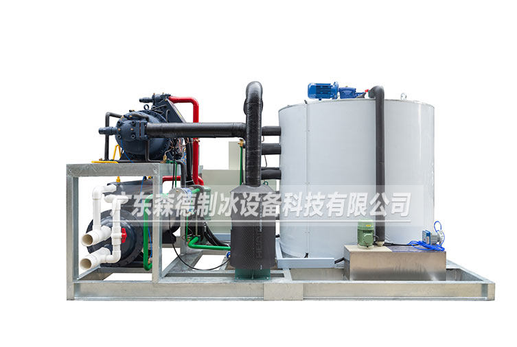 片冰機主要由壓縮機、膨脹閥、冷凝器、蒸發器組成,形成一個循環封閉的制冷系統。片冰機蒸發器為垂直豎立的桶裝結構,主要由冰刀、主軸、灑水盤、接水盤組成。它們在減速機的帶動下,逆時針緩慢旋轉。水從片冰機蒸發器的進水口進入分水盤,通過灑水盤,將水均勻的灑在蒸發器內壁,形成水膜;水膜與蒸發器流道中的制冷劑進行熱交換,溫度迅速降低,在蒸發器內壁上形成一層薄冰,在冰刀的擠壓下,碎裂成片冰,從落冰口掉入儲冰庫。部分未結成冰的水通過接水盤從回水口回流到冷水箱內,通過冷水循環泵進入下一個循環。