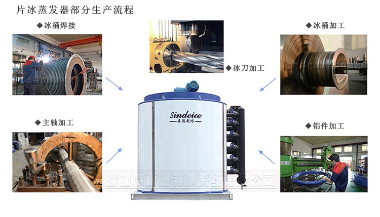片冰機蒸發(fā)器作為片冰機蒸發(fā)產(chǎn)冰的組件,是機器產(chǎn)能及產(chǎn)冰質(zhì)量最重要的部件。森德制冰具備多年的片冰機設(shè)計和生產(chǎn)制造經(jīng)驗,根據(jù)客戶的用冰需求,我工廠可單獨代工蒸發(fā)器單桶。客戶可匹配自有的制冷機組,進行安裝調(diào)試,滿足生產(chǎn)需求。